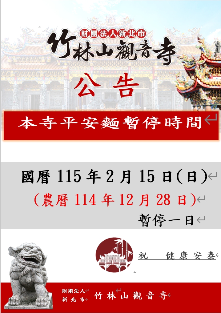 2月15日(農12/28)平安餐暫停一次